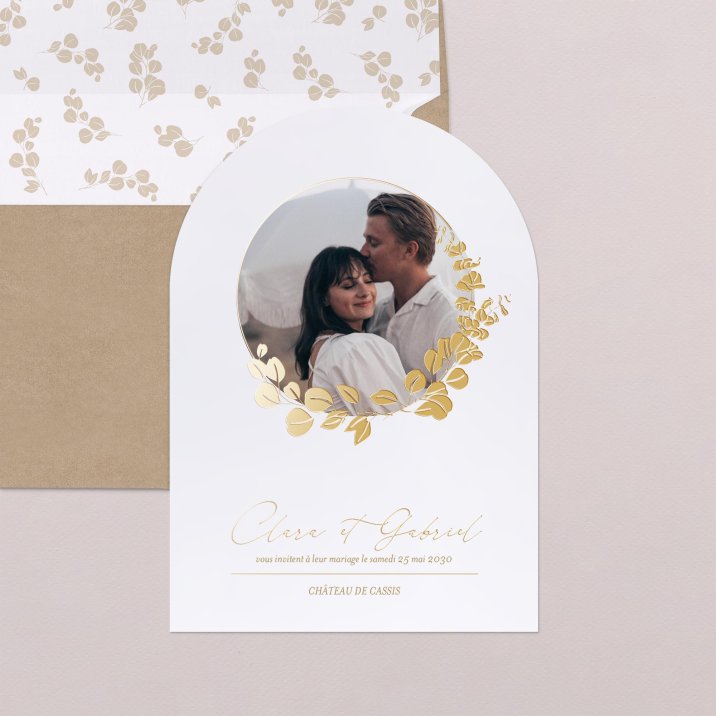 Sur le faire-part de mariage La Traviata, une élégante couronne végétale vient sublimer votre photo de couple préférée. Ennoblie d’or, cette composition contemporaine annoncera, de la plus jolie des façons, votre union prochaine.