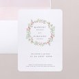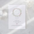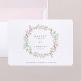 Sur le faire-part de mariage Round romance, une délicate couronne de fleurs roses en aquarelle vient s'apposer sur votre heureuse annonce. Cette papeterie raffinée et romantique contera, avec douceur, votre union prochaine.