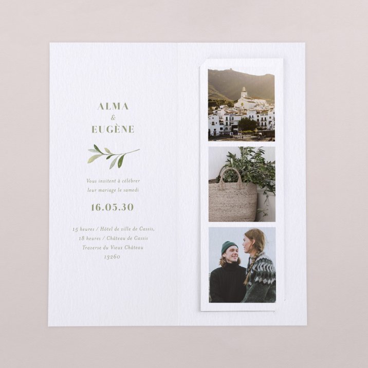 Ce faire-part se compose d'une carte double-volet et d'un photomaton, glissé à l'intérieur. Personnalisez l'ensemble avec les photos de votre choix ainsi que les détails de votre mariage.