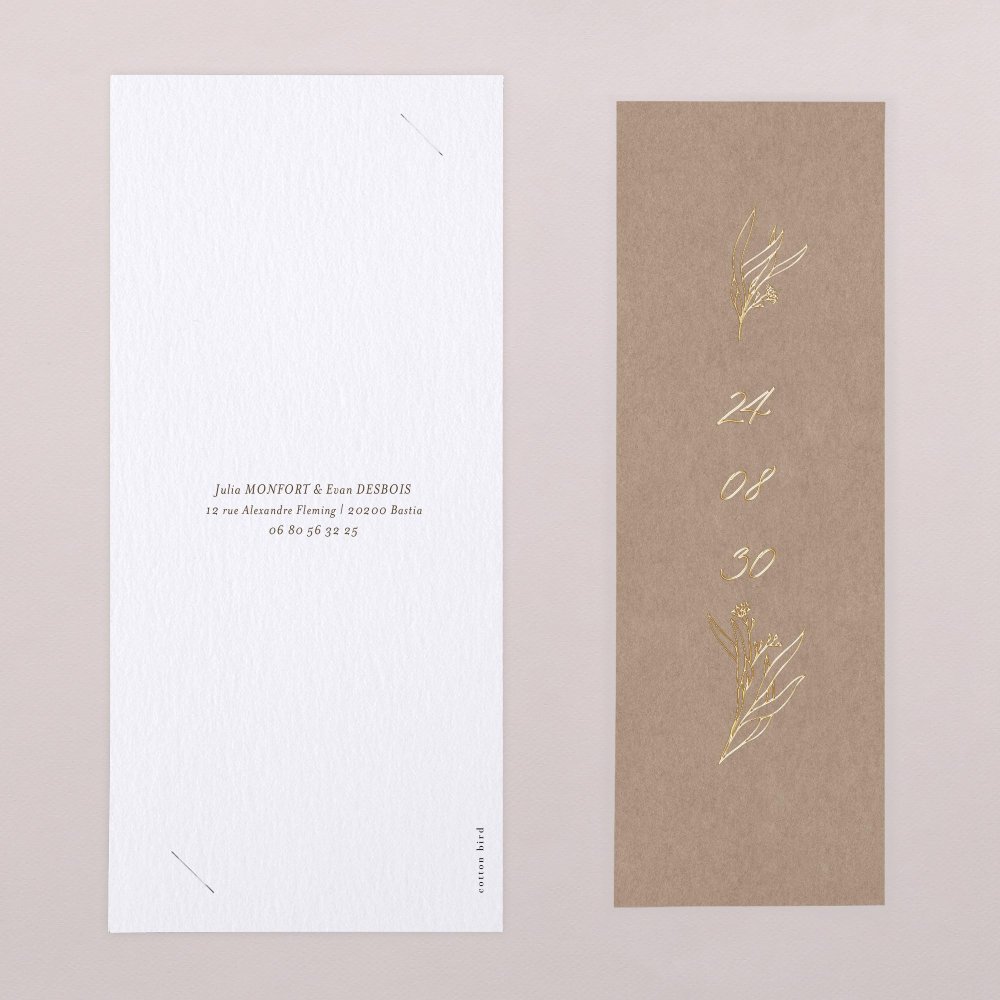 Sur le faire-part de mariage Mozart, une intemporelle couronne végétale entoure avec finesse vos prénoms. Ennobli de dorures raffinées et sublimé d’un papier d’aspect kraft, ce modèle sera parfait pour une cérémonie de mariage au thème nature.