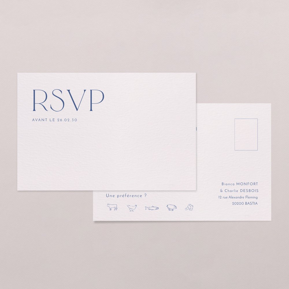 Glissez simplement ces cartes réponse dans l'enveloppe avec vos faire-part. Conçues comme de véritables cartes postales avec un espace pour le timbre et votre adresse postale d'ores et déjà renseignée, vos invités n'auront plus qu'à indiquer leur réponse avant de vous la retourner.