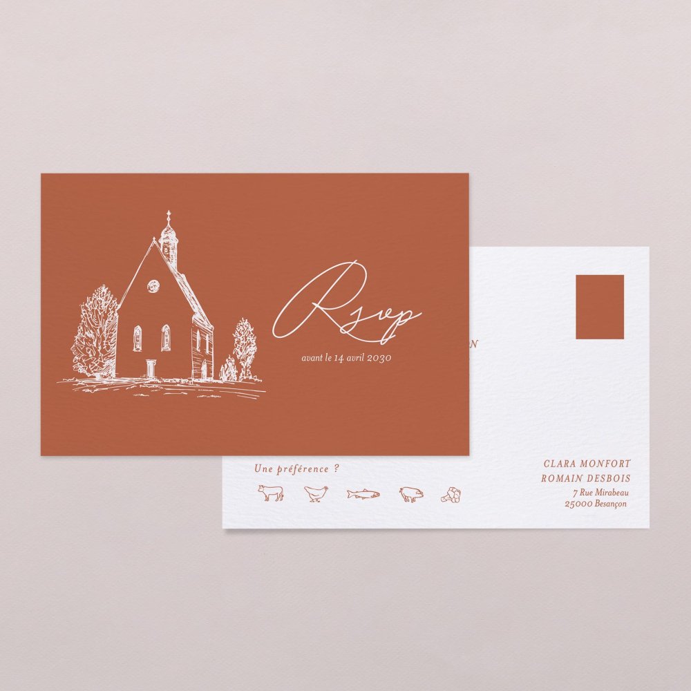 Glissez simplement ces cartes réponse dans l'enveloppe avec vos faire-part. Conçues comme de véritables cartes postales avec un espace pour le timbre et votre adresse postale d'ores et déjà renseignée, vos invités n'auront plus qu'à indiquer leur réponse avant de vous la retourner.