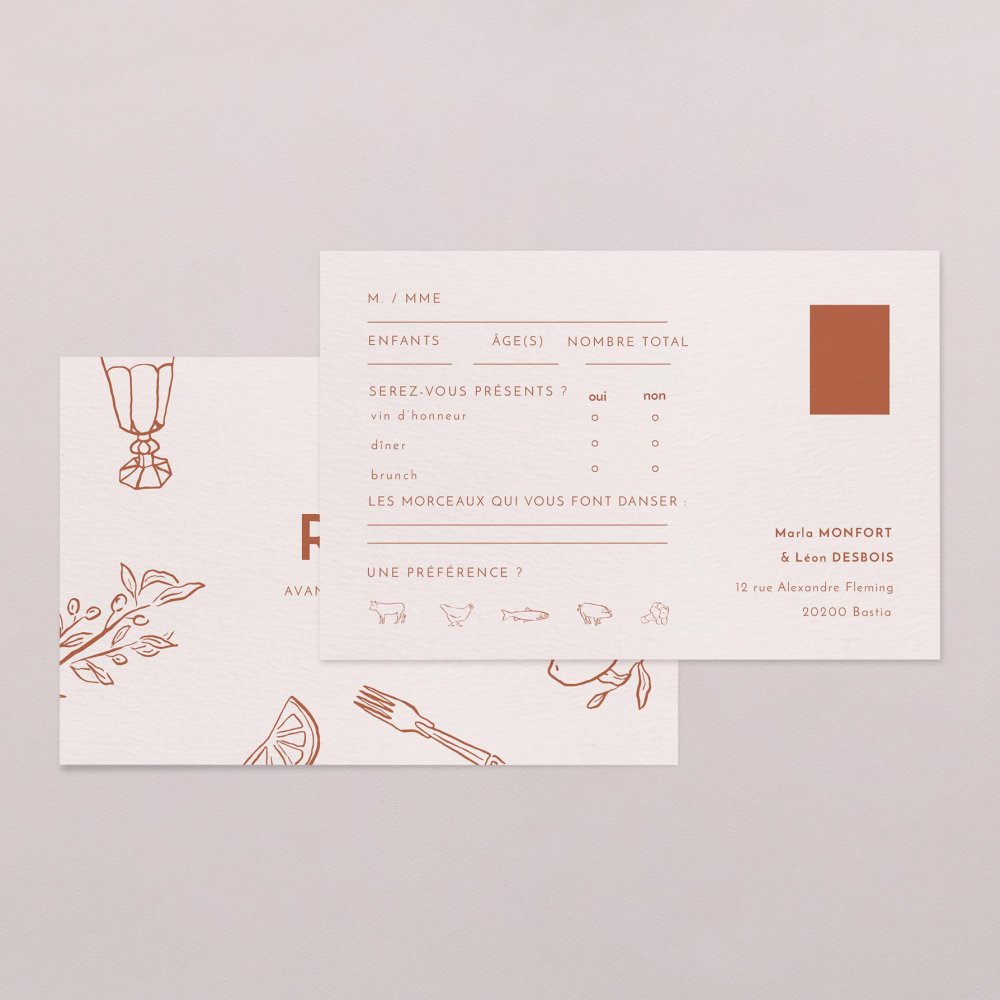 Glissez simplement ces cartes réponse dans l'enveloppe avec vos faire-part. Conçues comme de véritables cartes postales avec un espace pour le timbre et votre adresse postale d'ores et déjà renseignée, vos invités n'auront plus qu'à indiquer leur réponse avant de vous la retourner.