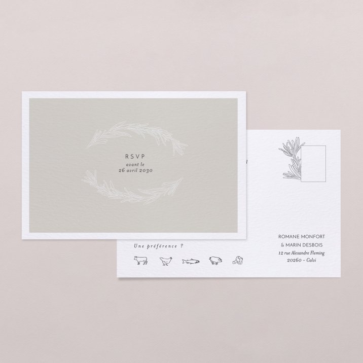 Glissez simplement ces cartes réponse dans l'enveloppe avec vos faire-part. Conçues comme de véritables cartes postales avec un espace pour le timbre et votre adresse postale d'ores et déjà renseignée, vos invités n'auront plus qu'à indiquer leur réponse avant de vous la retourner.