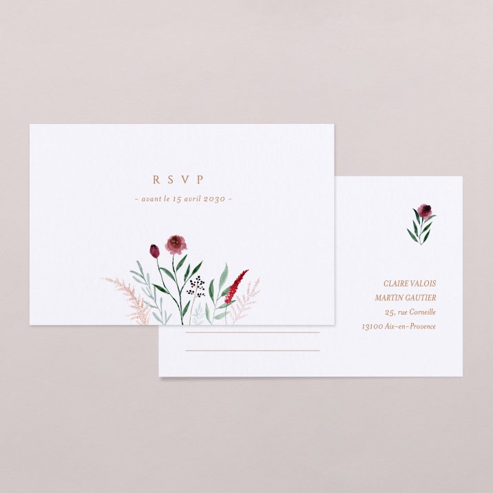 Glissez simplement ces cartes réponse dans l'enveloppe avec vos faire-part. Conçues comme de véritables cartes postales avec un espace pour le timbre et votre adresse postale d'ores et déjà renseignée, vos invités n'auront plus qu'à indiquer leur réponse avant de vous la retourner.