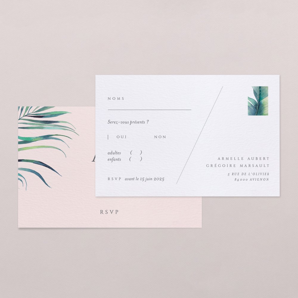 Glissez simplement ces cartes réponse dans l'enveloppe avec vos faire-part. Conçues comme de véritables cartes postales avec un espace pour le timbre et votre adresse postale d'ores et déjà renseignée, vos invités n'auront plus qu'à indiquer leur réponse avant de vous la retourner.