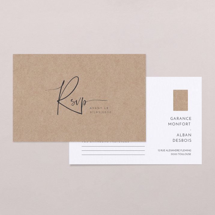 Glissez simplement ces cartes réponse dans l'enveloppe avec vos faire-part. Conçues comme de véritables cartes postales avec un espace pour le timbre et votre adresse postale d'ores et déjà renseignée, vos invités n'auront plus qu'à indiquer leur réponse avant de vous la retourner.