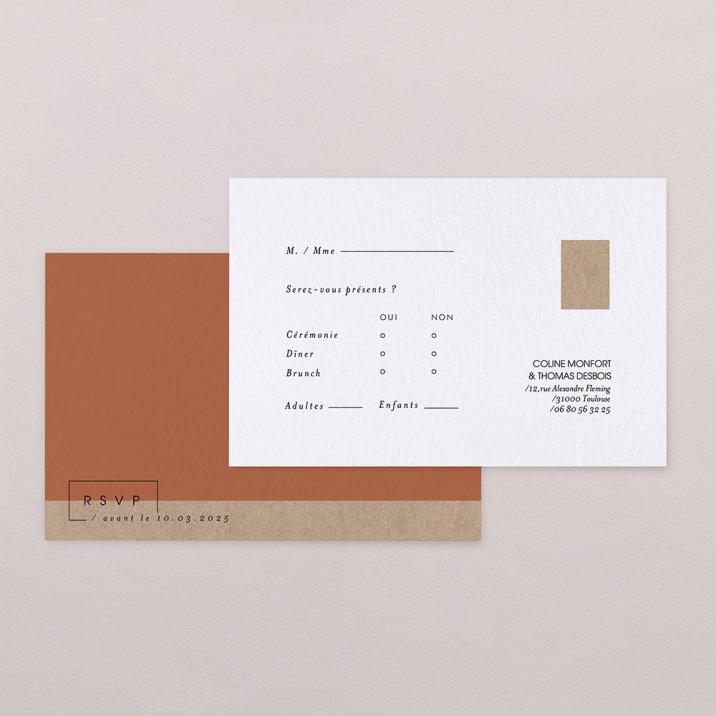 Glissez simplement ces cartes réponse dans l'enveloppe avec vos faire-part. Conçues comme de véritables cartes postales avec un espace pour le timbre et votre adresse postale d'ores et déjà renseignée, vos invités n'auront plus qu'à indiquer leur réponse avant de vous la retourner.