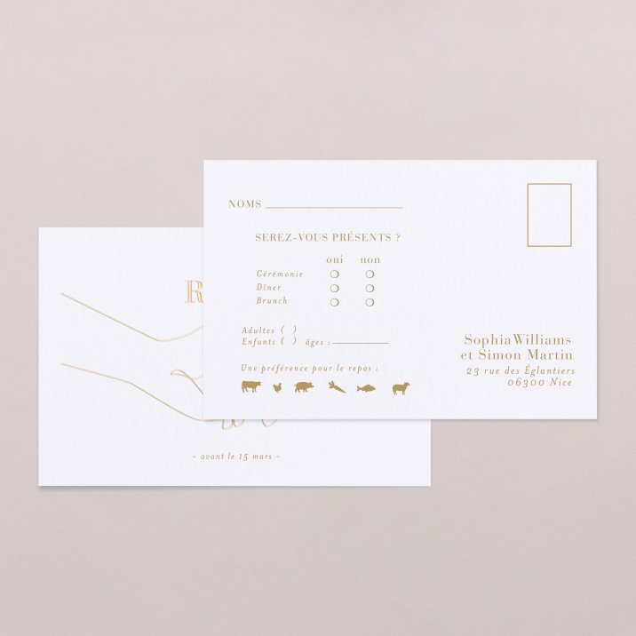Glissez simplement ces cartes réponse dans l'enveloppe avec vos faire-part. Conçues comme de véritables cartes postales avec un espace pour le timbre et votre adresse postale d'ores et déjà renseignée, vos invités n'auront plus qu'à indiquer leur réponse avant de vous la retourner.
