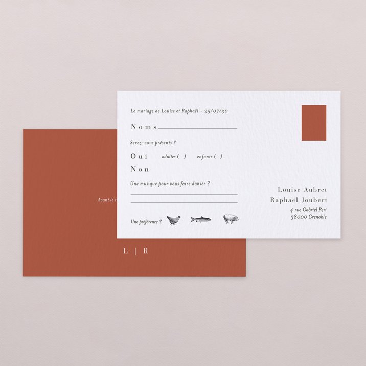 Glissez simplement ces cartes réponse dans l'enveloppe avec vos faire-part. Conçues comme de véritables cartes postales avec un espace pour le timbre et votre adresse postale d'ores et déjà renseignée, vos invités n'auront plus qu'à indiquer leur réponse avant de vous la retourner.