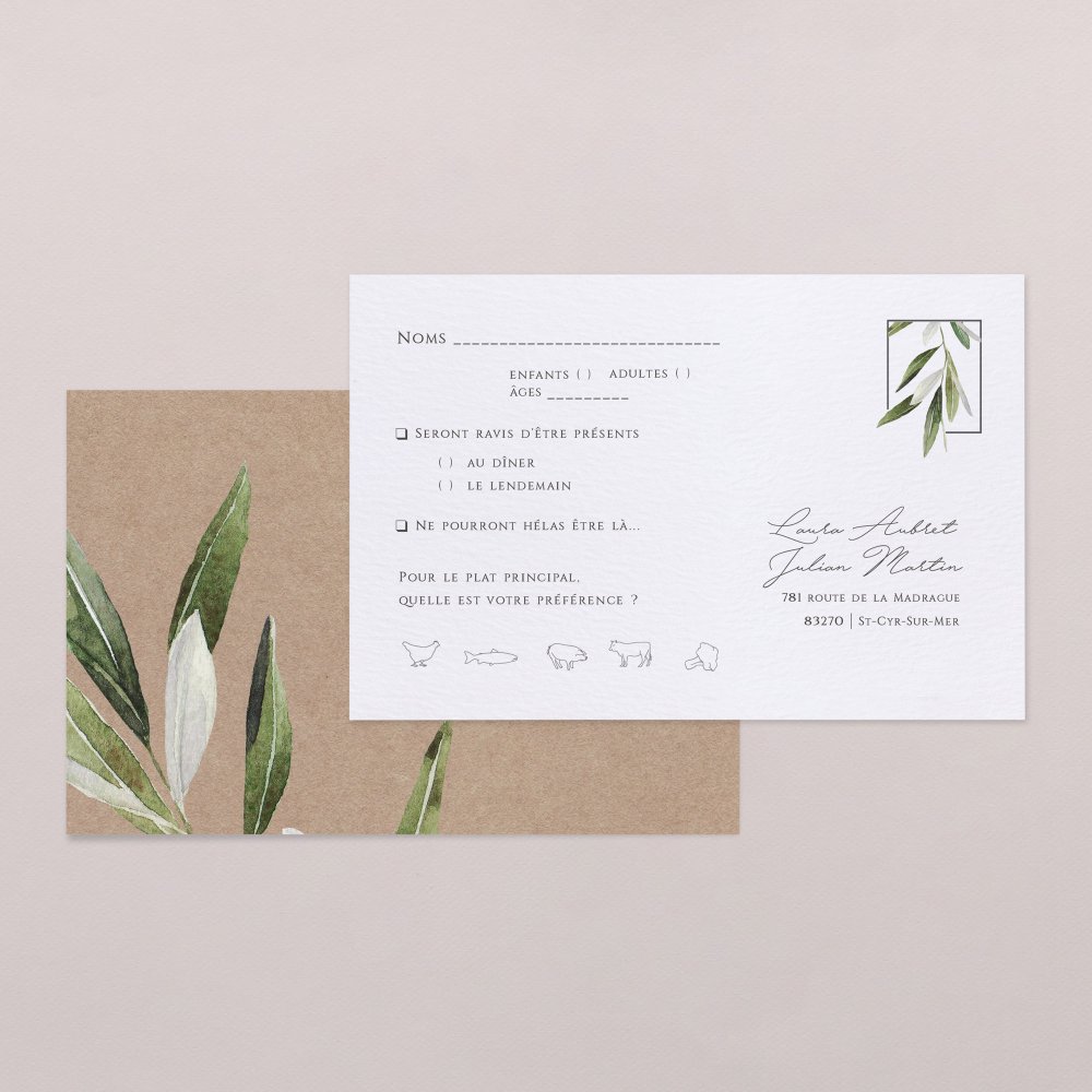 Glissez simplement ces cartes réponse dans l'enveloppe avec vos faire-part. Conçues comme de véritables cartes postales avec un espace pour le timbre et votre adresse postale d'ores et déjà renseignée, vos invités n'auront plus qu'à indiquer leur réponse avant de vous la retourner.