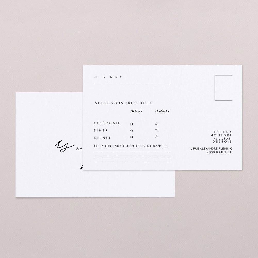 Glissez simplement ces cartes réponse dans l'enveloppe avec vos faire-part. Conçues comme de véritables cartes postales avec un espace pour le timbre et votre adresse postale d'ores et déjà renseignée, vos invités n'auront plus qu'à indiquer leur réponse avant de vous la retourner.
