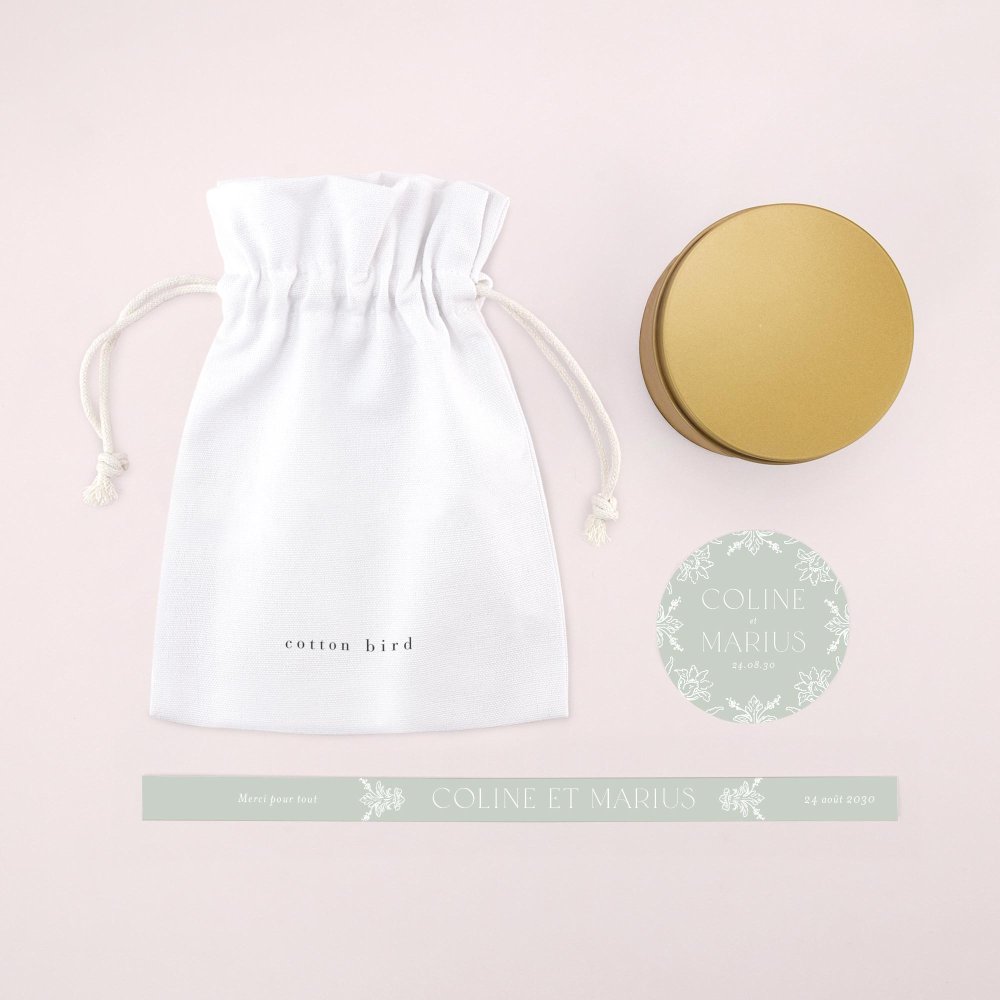 Présentée dans une élégante boîte en métal dorée, elle est personnalisable avec vos prénoms, la date de votre union ainsi qu’un petit mot de votre choix.