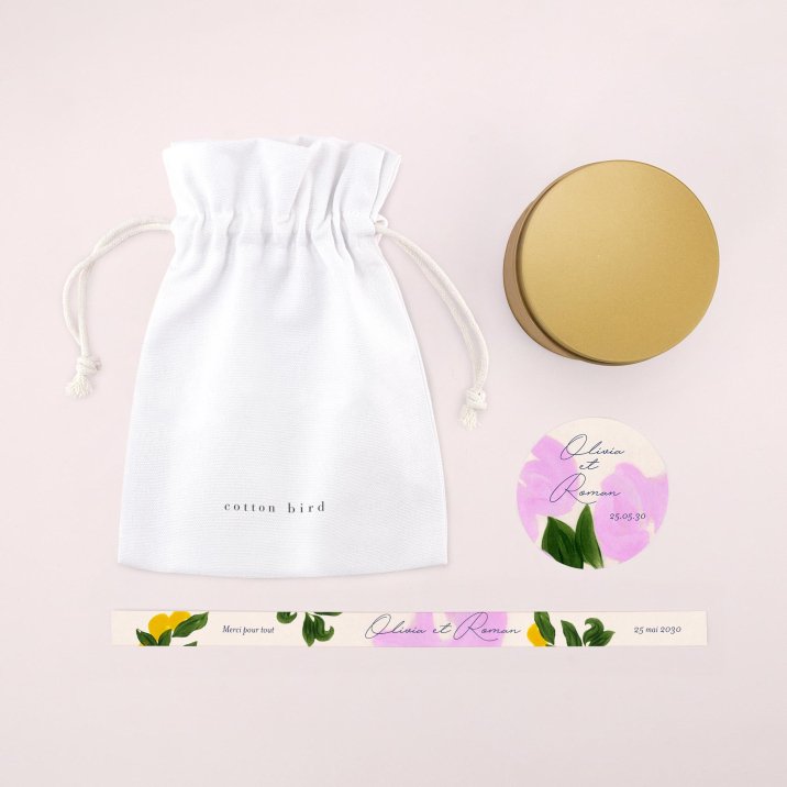 Notre bougie dorée est le cadeau d’invité parfait à offrir à votre mariage ! Son délicat parfum aux notes de figuier replongera vos invités dans les précieux souvenirs de cette journée. Présentée dans une élégante boîte en métal dorée, elle est personnalisable avec vos prénoms, la date de votre union ainsi qu’un petit mot de votre choix. Notre bougie dorée est fabriquée en France. Elle est délivrée dans son joli pochon en coton et comprend deux étiquettes adhésives, à personnaliser et à fixer par vos soins. Parfum Cotton Bird : Sous le figuier Notes de tête : miel, notes vertes, figue, cannelle Notes de cœur : rose, pomme, noix de coco Notes de fond : patchouli, vanille, santal, lait
