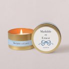 Notre bougie dorée est le cadeau d’invité parfait à offrir à votre mariage ! Son délicat parfum aux notes de figuier replongera vos invités dans les précieux souvenirs de cette journée. Présentée dans une élégante boîte en métal dorée, elle est personnalisable avec vos prénoms, la date de votre union ainsi qu’un petit mot de votre choix. Notre bougie dorée est fabriquée en France. Elle est délivrée dans son joli pochon en coton et comprend deux étiquettes adhésives, à personnaliser et à fixer par vos soins. Parfum Cotton Bird : Sous le figuier Notes de tête : miel, notes vertes, figue, cannelle Notes de cœur : rose, pomme, noix de coco Notes de fond : patchouli, vanille, santal, lait