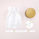 Notre bougie dorée est le cadeau d’invité parfait à offrir à votre mariage ! Son délicat parfum aux notes de figuier replongera vos invités dans les précieux souvenirs de cette journée. Présentée dans une élégante boîte en métal dorée, elle est personnalisable avec vos prénoms, la date de votre union ainsi qu’un petit mot de votre choix. Notre bougie dorée est fabriquée en France. Elle est délivrée dans son joli pochon en coton et comprend deux étiquettes adhésives, à personnaliser et à fixer par vos soins. Parfum Cotton Bird : Sous le figuier Notes de tête : miel, notes vertes, figue, cannelle Notes de cœur : rose, pomme, noix de coco Notes de fond : patchouli, vanille, santal, lait