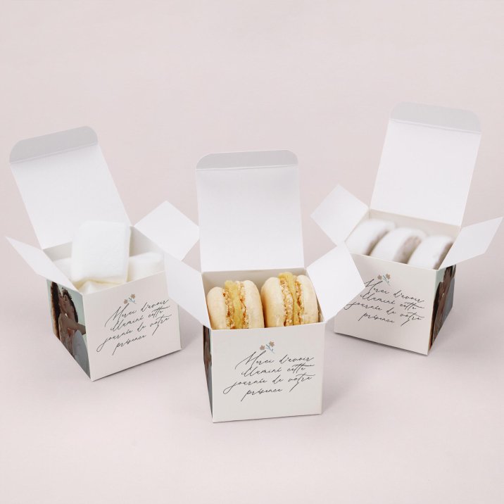 C'est la petite boîte (5,4 x 5,4 cm) parfaite pour y placer des confiseries, dragées ou autres jolies surprises. Un cadeau invité mariage original à déposer sur les tables, puis à offrir à vos invités en souvenir de votre beau jour !