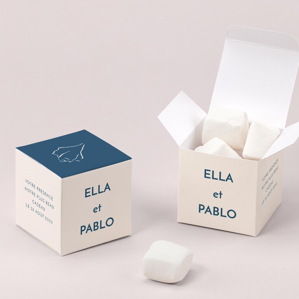 C'est la petite boîte (5,4 x 5,4 cm) parfaite pour y placer des confiseries, dragées ou autres jolies surprises. Un cadeau invité mariage original à déposer sur les tables, puis à offrir à vos invités en souvenir de votre beau jour !