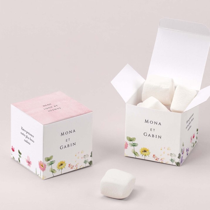 C'est la petite boîte (5,4 x 5,4 cm) parfaite pour y placer des confiseries, dragées ou autres jolies surprises. Un cadeau invité mariage original à déposer sur les tables, puis à offrir à vos invités en souvenir de votre beau jour !