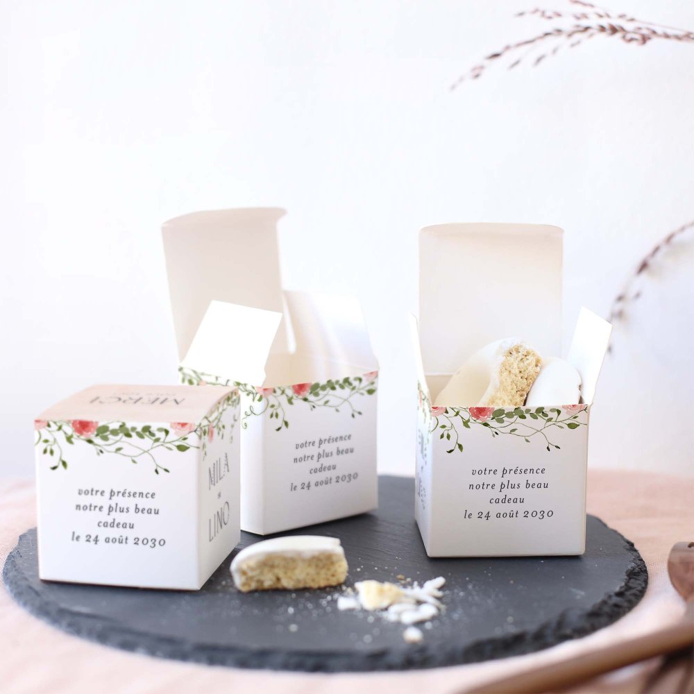 C'est la petite boîte (5,4 x 5,4 cm) parfaite pour y placer des confiseries, dragées ou autres jolies surprises. Un cadeau invité mariage original à déposer sur les tables, puis à offrir à vos invités en souvenir de votre beau jour !