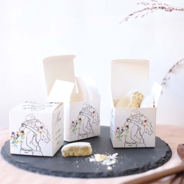 C'est la petite boîte (5,4 x 5,4 cm) parfaite pour y placer des confiseries, dragées ou autres jolies surprises. Un cadeau invité mariage original à déposer sur les tables, puis à offrir à vos invités en souvenir de votre beau jour !