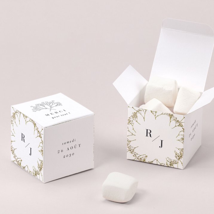 C'est la petite boîte (5,4 x 5,4 cm) parfaite pour y placer des confiseries, dragées ou autres jolies surprises. Un cadeau invité mariage original à déposer sur les tables, puis à offrir à vos invités en souvenir de votre beau jour !