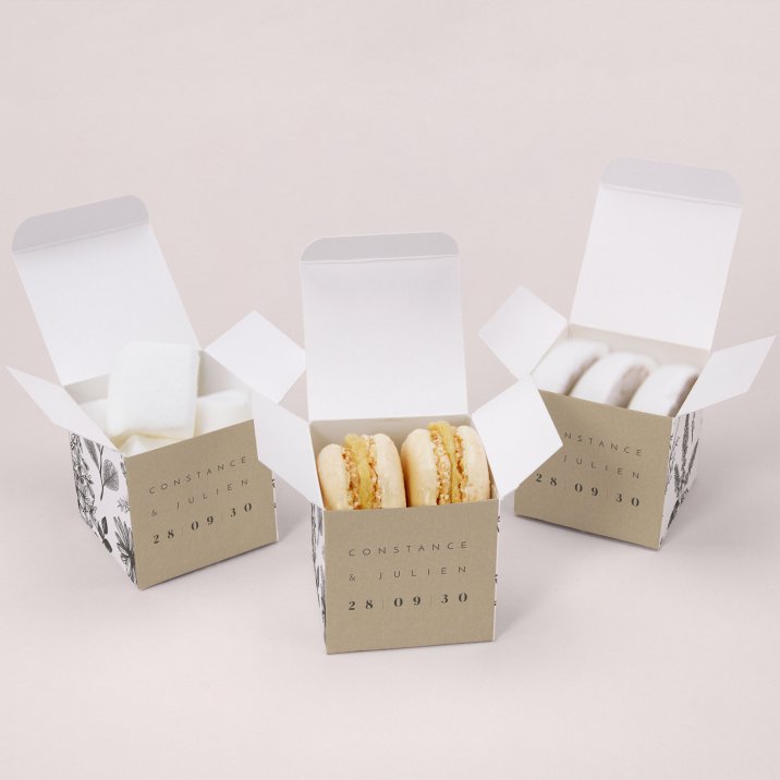 C'est la petite boîte (5,4 x 5,4 cm) parfaite pour y placer des confiseries, dragées ou autres jolies surprises. Un cadeau invité mariage original à déposer sur les tables, puis à offrir à vos invités en souvenir de votre beau jour !