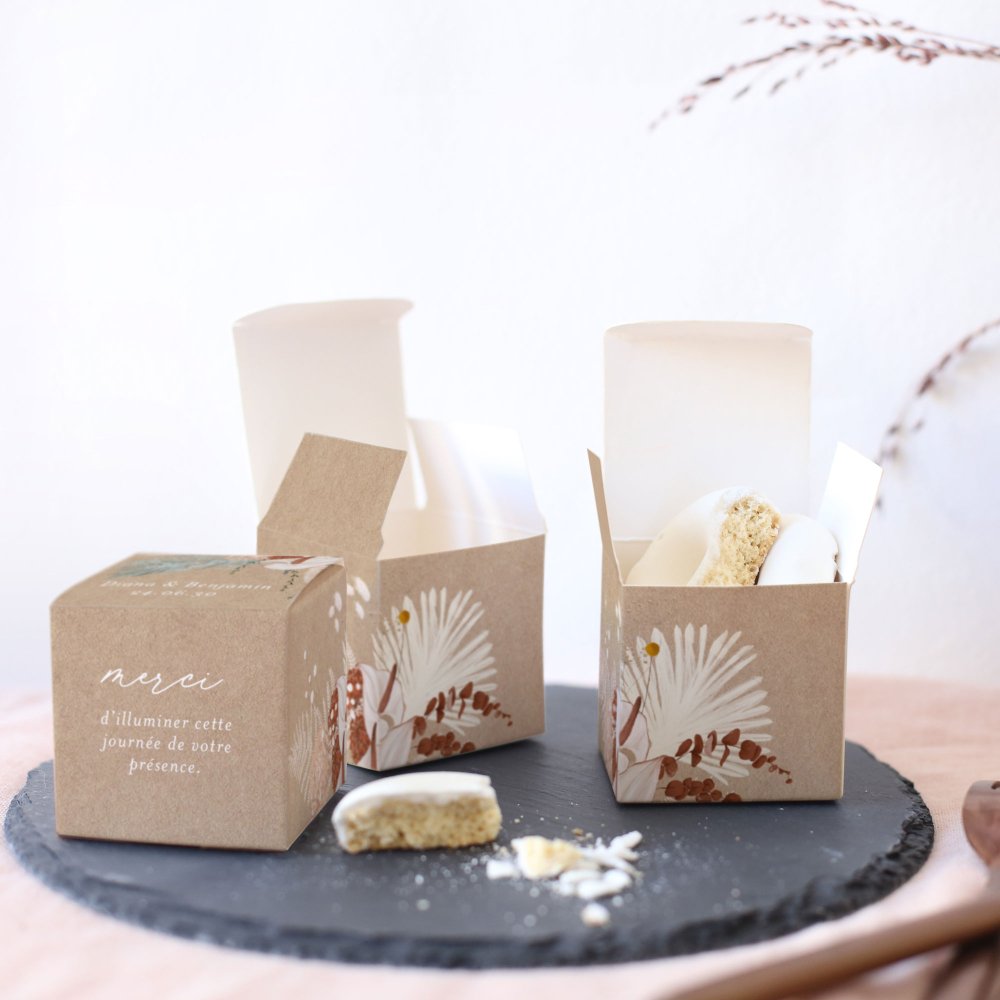 C'est la petite boîte (5,4 x 5,4 cm) parfaite pour y placer des confiseries, dragées ou autres jolies surprises. Un cadeau invité mariage original à déposer sur les tables, puis à offrir à vos invités en souvenir de votre beau jour !