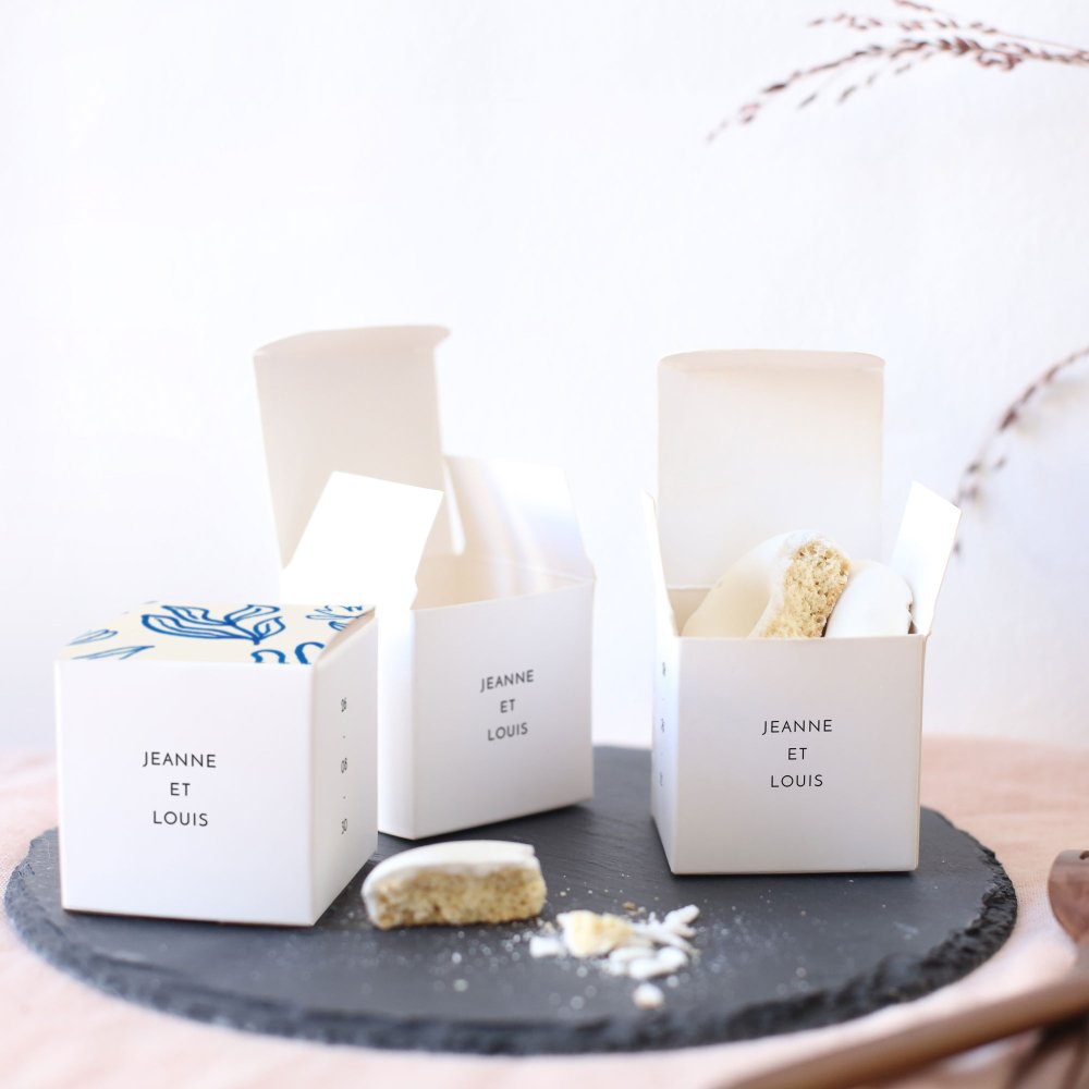 C'est la petite boîte (5,4 x 5,4 cm) parfaite pour y placer des confiseries, dragées ou autres jolies surprises. Un cadeau invité mariage original à déposer sur les tables, puis à offrir à vos invités en souvenir de votre beau jour !
