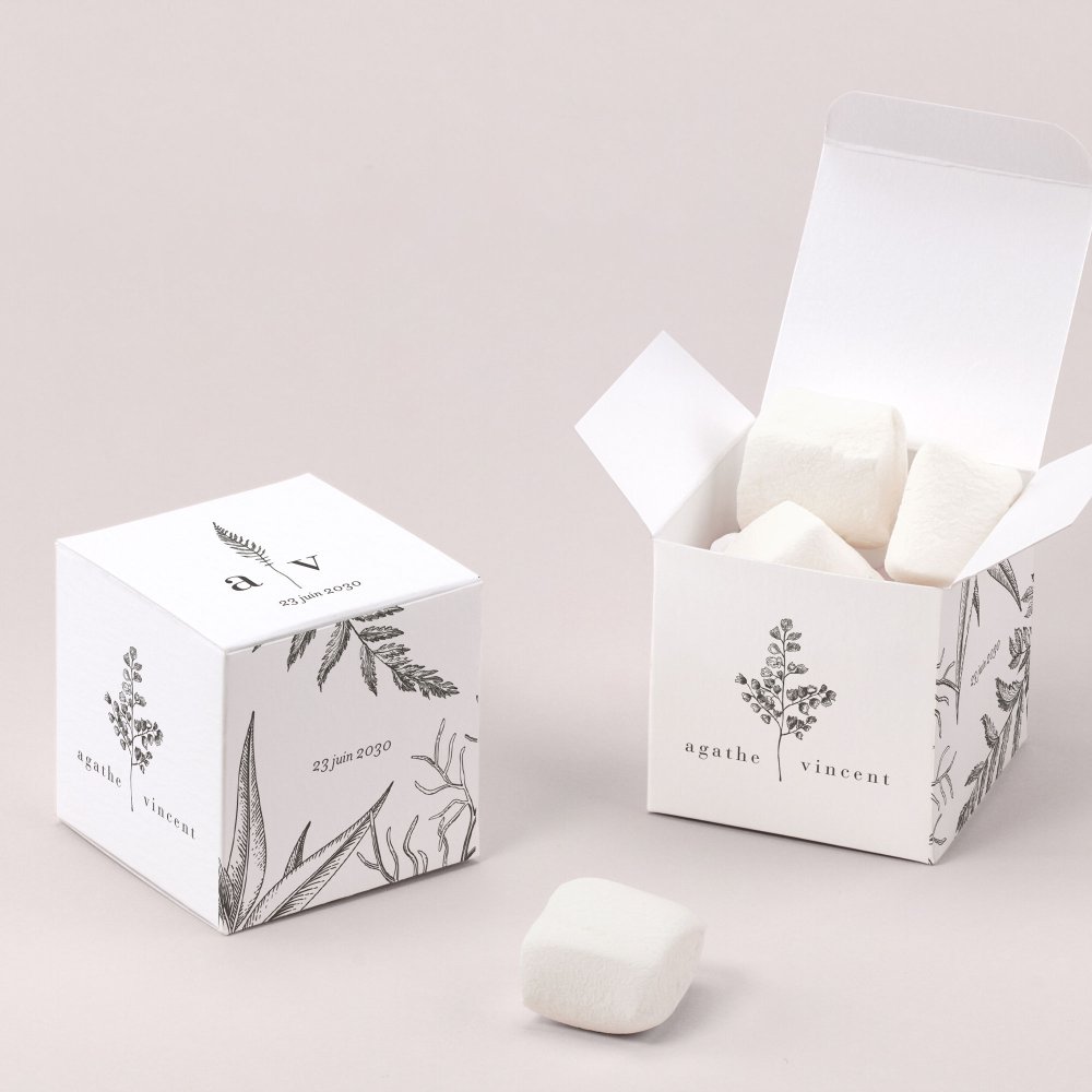 C'est la petite boîte (5,4 x 5,4 cm) parfaite pour y placer des confiseries, dragées ou autres jolies surprises. Un cadeau invité mariage original à déposer sur les tables, puis à offrir à vos invités en souvenir de votre beau jour !
