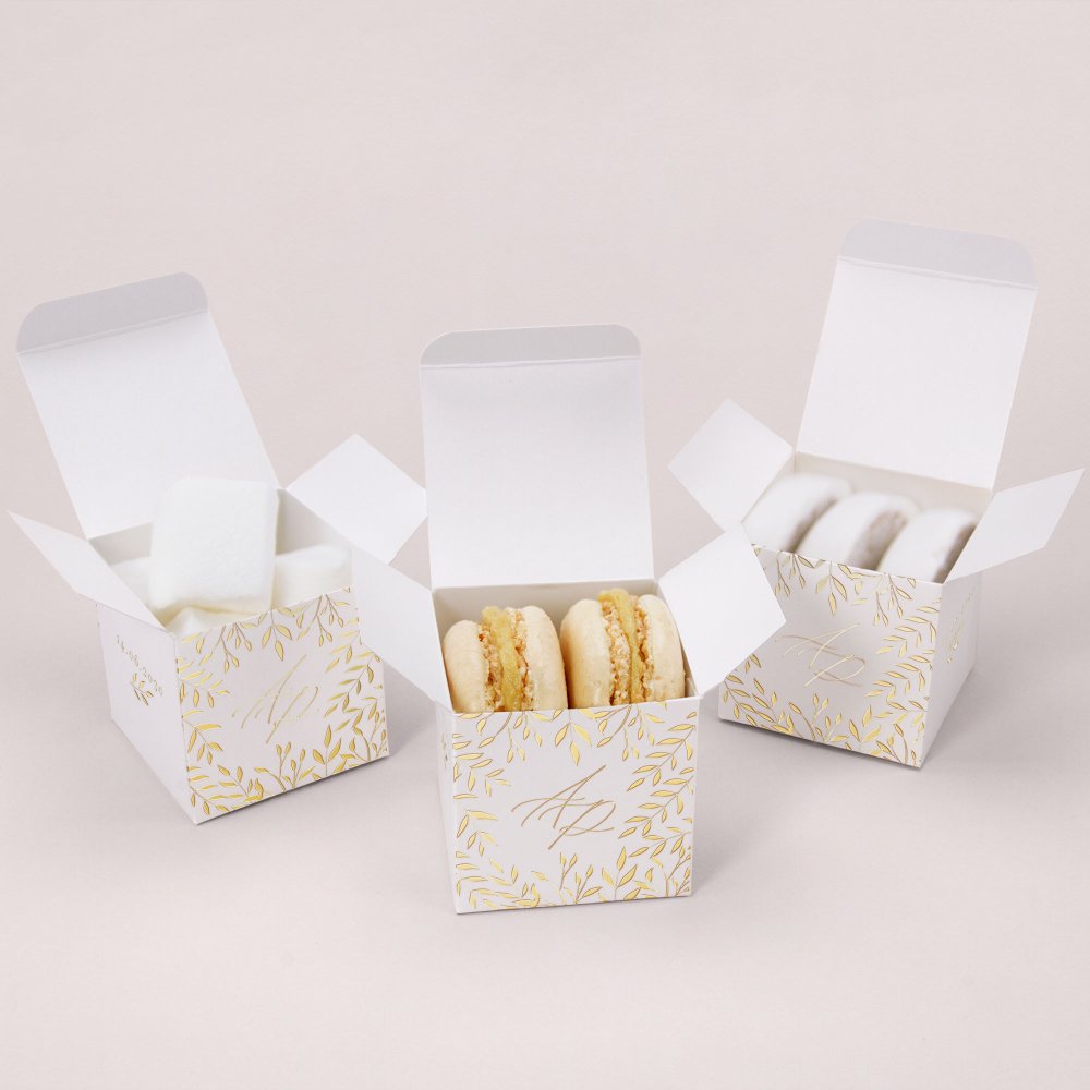C'est la petite boîte (5,4 x 5,4 cm) parfaite pour y placer des confiseries, dragées ou autres jolies surprises. Un cadeau invité mariage original à déposer sur les tables, puis à offrir à vos invités en souvenir de votre beau jour !