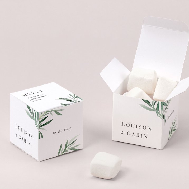 C'est la petite boîte (5,4 x 5,4 cm) parfaite pour y placer des confiseries, dragées ou autres jolies surprises. Un cadeau invité mariage original à déposer sur les tables, puis à offrir à vos invités en souvenir de votre beau jour !