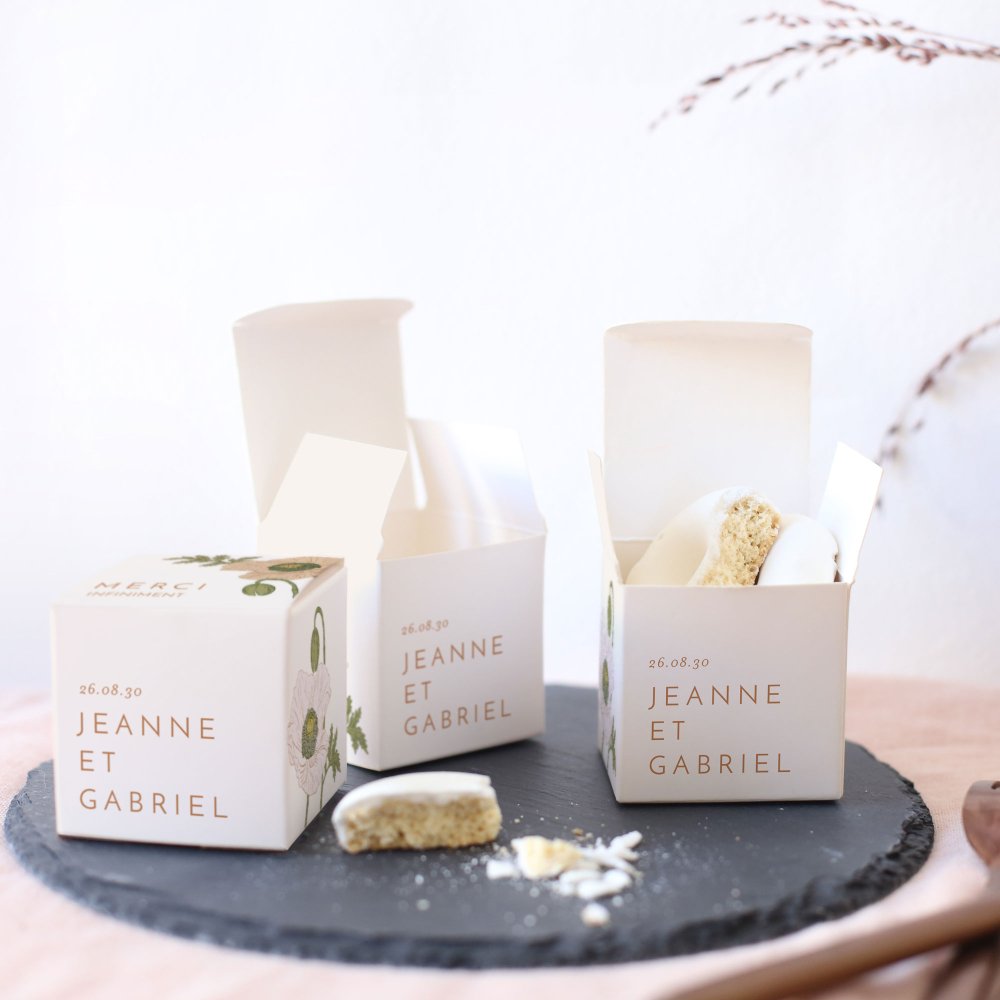 C'est la petite boîte (5,4 x 5,4 cm) parfaite pour y placer des confiseries, dragées ou autres jolies surprises. Un cadeau invité mariage original à déposer sur les tables, puis à offrir à vos invités en souvenir de votre beau jour !