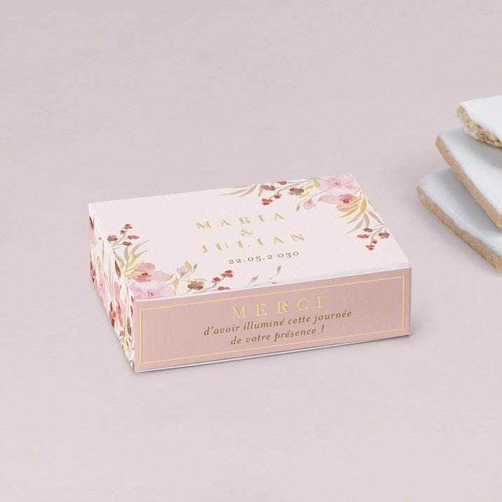 Sublimée avec vos prénoms, la date de votre mariage et votre mot de remerciement, elle est à garnir avec de petits biscuits ou douceurs de votre choix (non inclus).