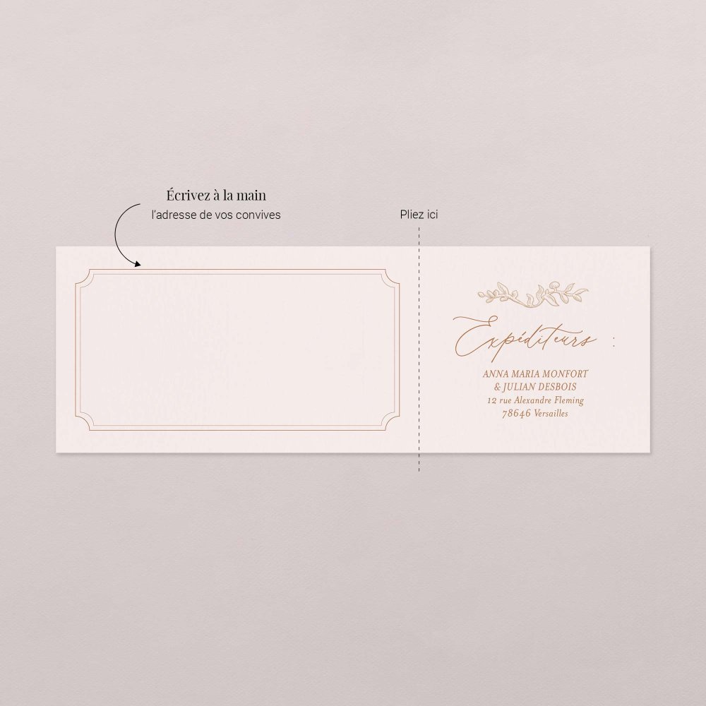 Votre adresse sera imprimée sur le côté droit (pour le dos de l'enveloppe), il ne vous restera ainsi plus qu'à écrire les adresses de vos invités sur le côté gauche pour les envoyer !