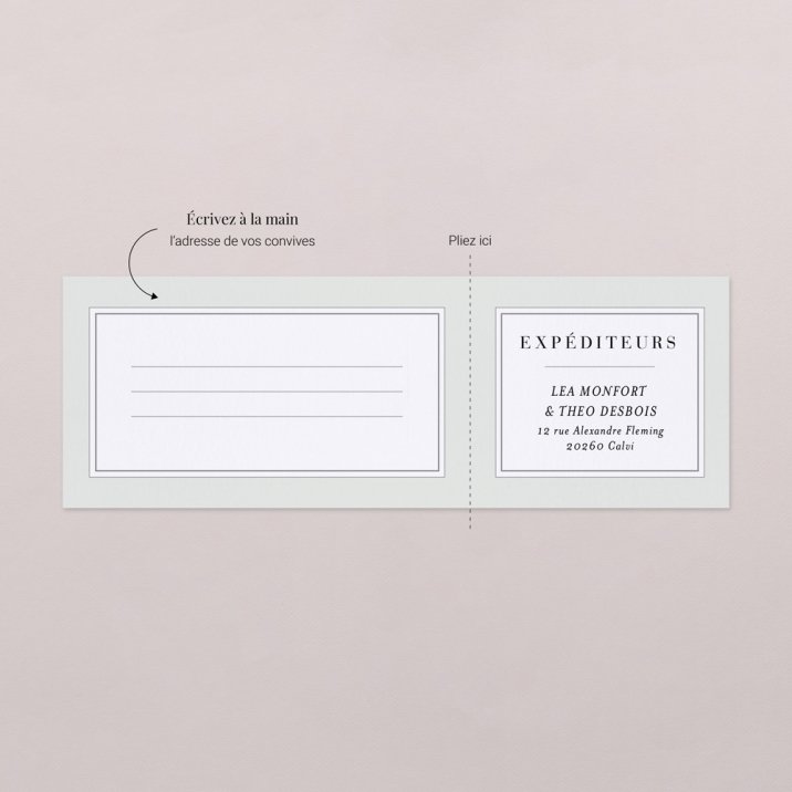 Votre adresse sera imprimée sur le côté droit (pour le dos de l'enveloppe), il ne vous restera ainsi plus qu'à écrire les adresses de vos invités sur le côté gauche pour les envoyer !