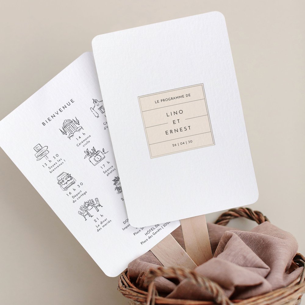 Distribués à l'entrée de la messe, ou à placer dans une grande corbeille à la disposition de chacun, nos éventails programme donnent le ton de la cérémonie, renseignent vos convives sur le déroulement de la journée et ... très utiles par grande chaleur, rafraîchiront l'assemblée !