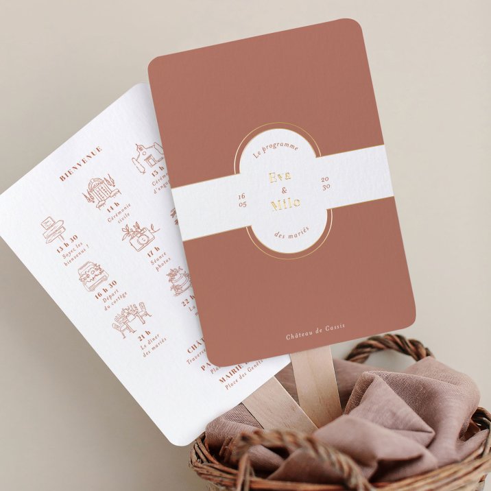 Distribués à l'entrée de la messe, ou à placer dans une grande corbeille à la disposition de chacun, nos éventails programme donnent le ton de la cérémonie, renseignent vos convives sur le déroulement de la journée et ... très utiles par grande chaleur, rafraîchiront l'assemblée !