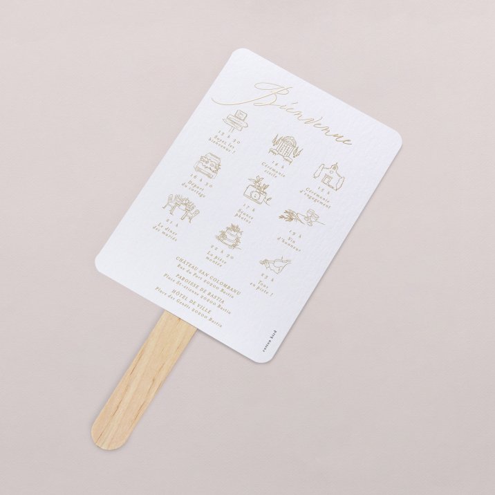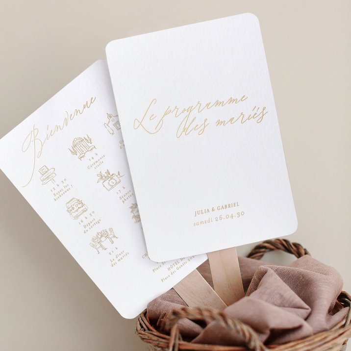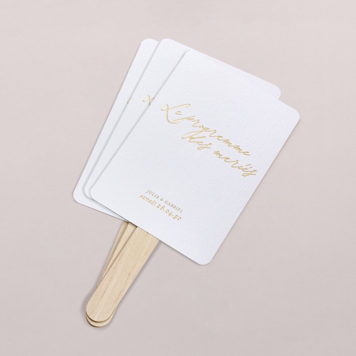 Distribués à l'entrée de la messe, ou à placer dans une grande corbeille à la disposition de chacun, nos éventails programme donnent le ton de la cérémonie, renseignent vos convives sur le déroulement de la journée et ... très utiles par grande chaleur, rafraîchiront l'assemblée !