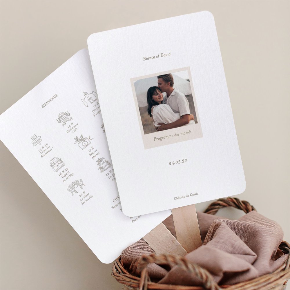 Distribués à l'entrée de la messe, ou à placer dans une grande corbeille à la disposition de chacun, nos éventails programme donnent le ton de la cérémonie, renseignent vos convives sur le déroulement de la journée et ... très utiles par grande chaleur, rafraîchiront l'assemblée !