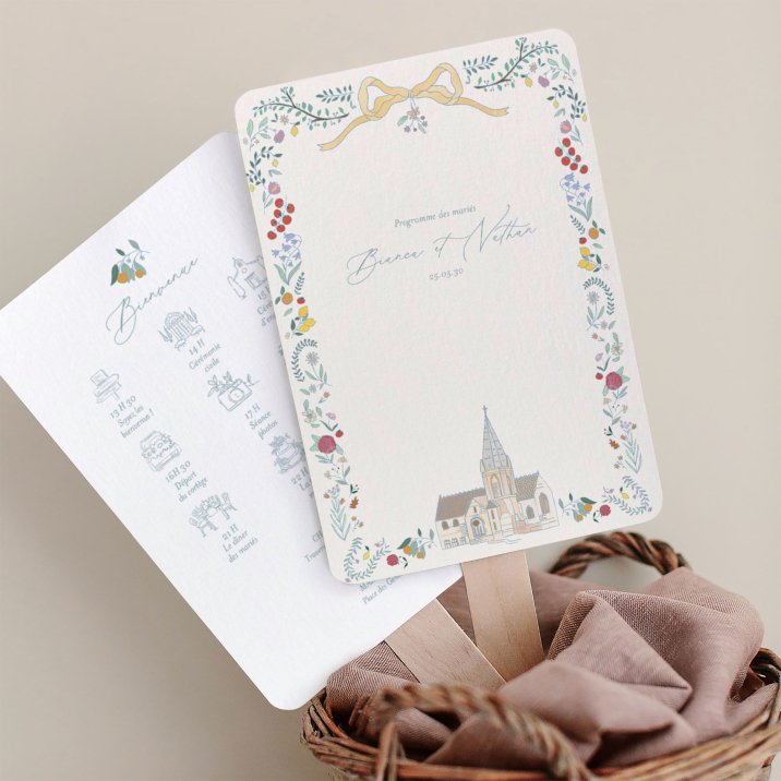 Distribués à l'entrée de la messe, ou à placer dans une grande corbeille à la disposition de chacun, nos éventails programme donnent le ton de la cérémonie, renseignent vos convives sur le déroulement de la journée et ... très utiles par grande chaleur, rafraîchiront l'assemblée !