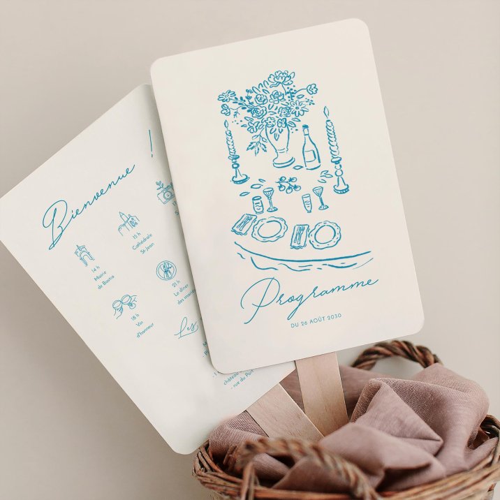 Distribués à l'entrée de la messe, ou à placer dans une grande corbeille à la disposition de chacun, nos éventails programme donnent le ton de la cérémonie, renseignent vos convives sur le déroulement de la journée et ... très utiles par grande chaleur, rafraîchiront l'assemblée !