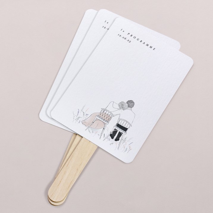 Distribués à l'entrée de la messe, ou à placer dans une grande corbeille à la disposition de chacun, nos éventails programme donnent le ton de la cérémonie, renseignent vos convives sur le déroulement de la journée et ... très utiles par grande chaleur, rafraîchiront l'assemblée !
