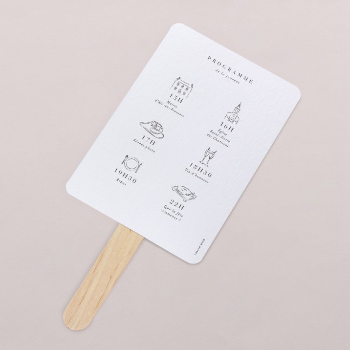 Distribués à l'entrée de la messe, ou à placer dans une grande corbeille à la disposition de chacun, nos éventails programme donnent le ton de la cérémonie, renseignent vos convives sur le déroulement de la journée et ... très utiles par grande chaleur, rafraîchiront l'assemblée !