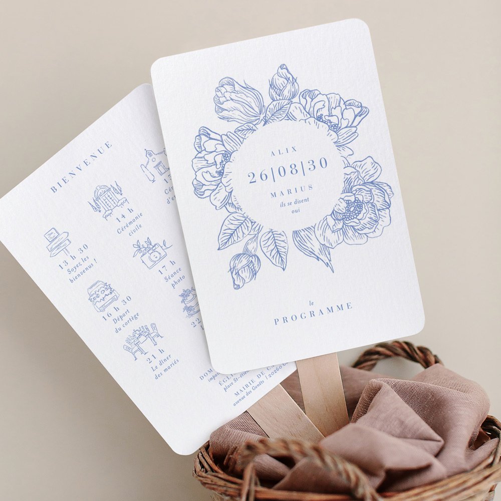 Distribués à l'entrée de la messe, ou à placer dans une grande corbeille à la disposition de chacun, nos éventails programme donnent le ton de la cérémonie, renseignent vos convives sur le déroulement de la journée et ... très utiles par grande chaleur, rafraîchiront l'assemblée !