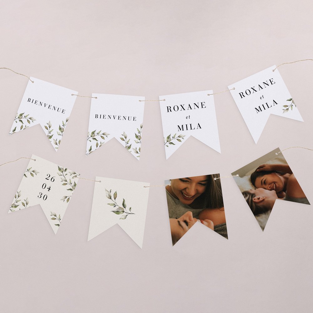Cette guirlande de 16 fanions recto-verso se personnalise avec vos prénoms, la photo de votre couple, la date de votre mariage, un petit mot de bienvenue…