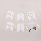 Cette guirlande de 16 fanions recto-verso se personnalise avec vos prénoms, la photo de votre couple, la date de votre mariage, un petit mot de bienvenue…