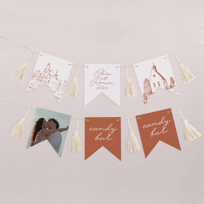 Cette guirlande de 16 fanions recto-verso se personnalise avec vos prénoms, la photo de votre couple, la date de votre mariage, un petit mot de bienvenue…