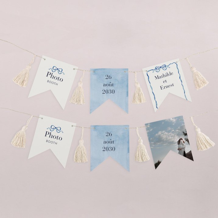 Cette guirlande de 16 fanions recto-verso se personnalise avec vos prénoms, la photo de votre couple, la date de votre mariage, un petit mot de bienvenue…