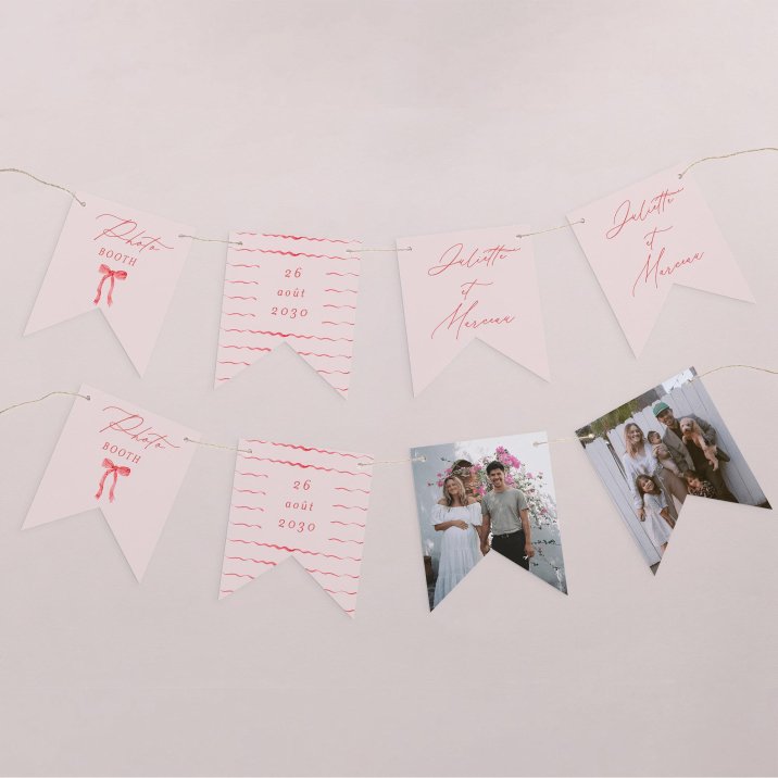 Cette guirlande de 16 fanions recto-verso se personnalise avec vos prénoms, la photo de votre couple, la date de votre mariage, un petit mot de bienvenue…
